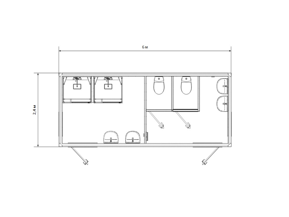 Комбинированный сантехнический блок-контейнер №6 на 6 метров с разделением на душевую и туалетную зоны. Четыре кабинки (2 душа + 2 туалета), 4 умывальника, отделка ПВХ. Аренда от 15 000 ₽/мес с доставкой за 24ч по России.
