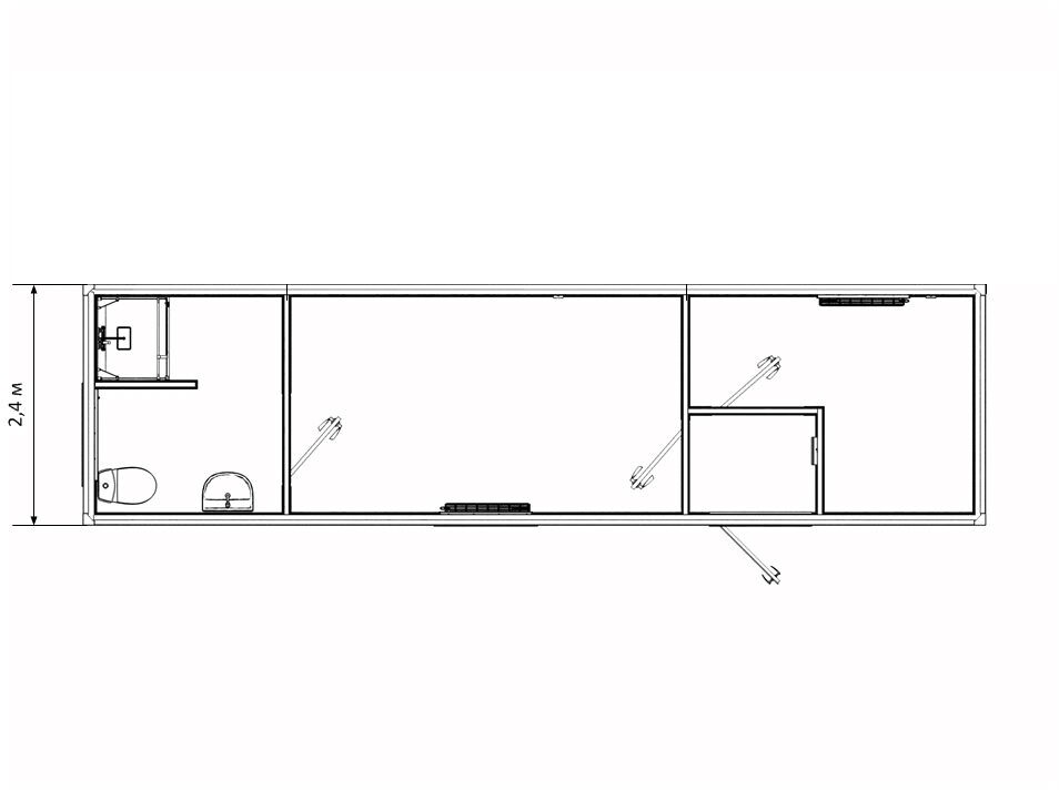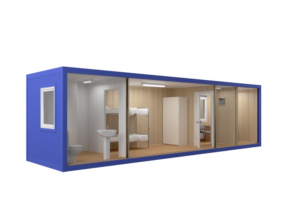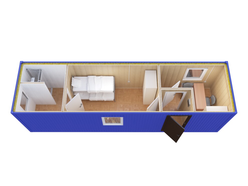 В 6-метровой версии комфортно размещаются 2 человека: одно спальное место в основной комнате и рабочий кабинет. В 9-метровой версии — до 4 человек: два спальных места в основной комнате, рабочий кабинет и полноценный санузел. Для вахтовых поселков рекомендуем использовать как модуль для руководителя или специалистов.