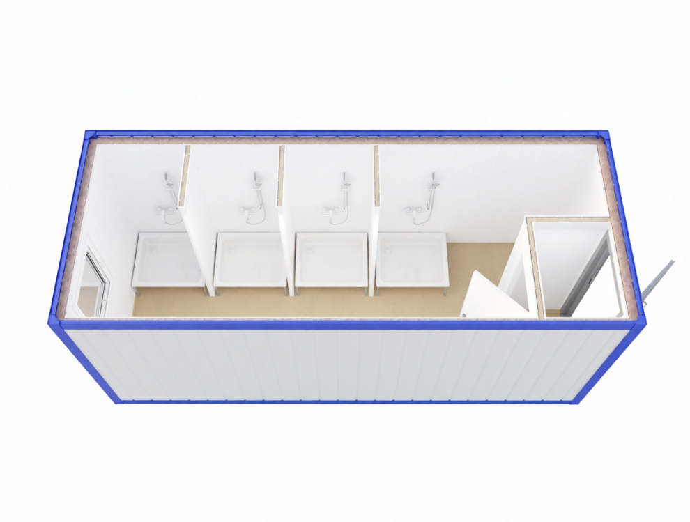 Четыре душевые кабинки и два умывальника рассчитаны на комфортное обслуживание 25-30 человек за 8-часовую смену. При интенсивной эксплуатации (вахтовые поселки) рекомендуем устанавливать два блока или добавлять мобильные душевые кабины для повышения пропускной способности.