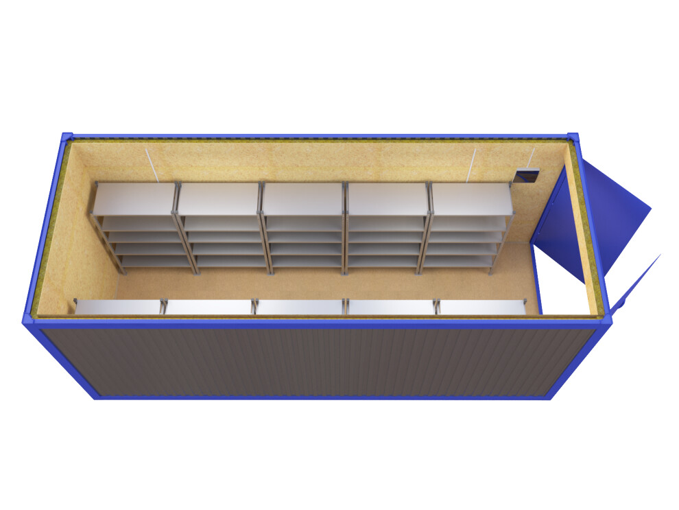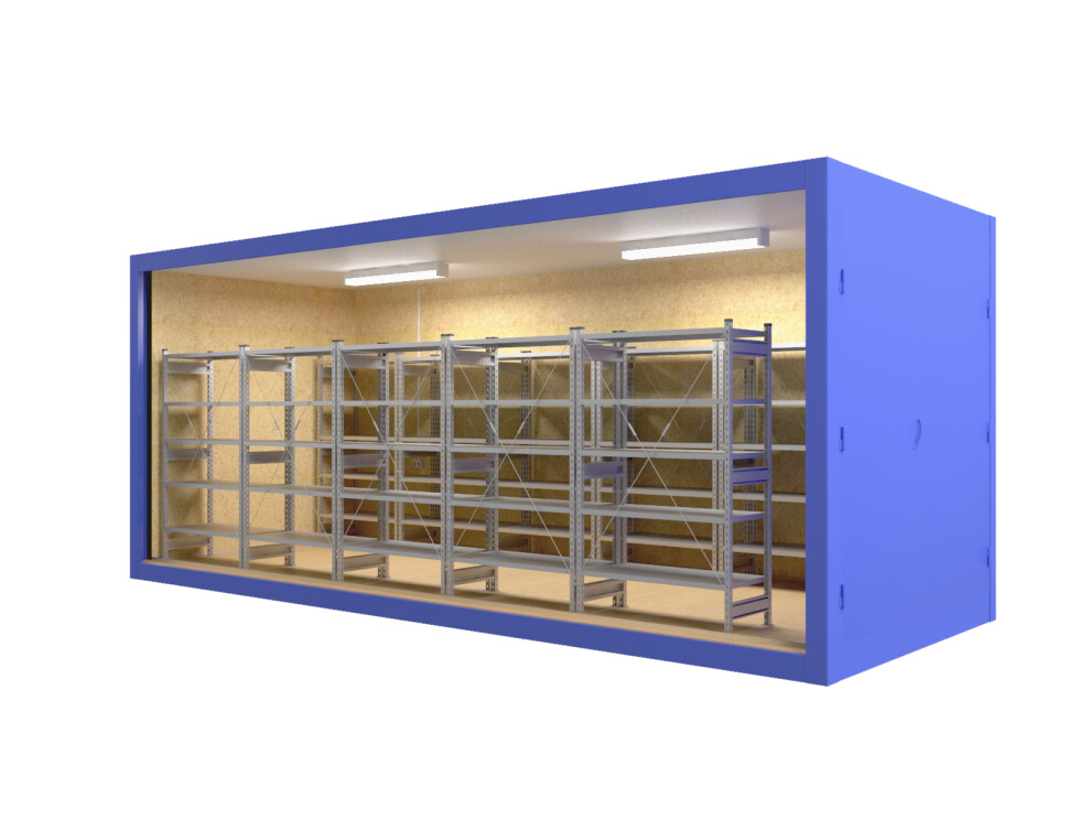 Универсальный складской блок-контейнер с распашными воротами 2×1,6м для крупногабаритных грузов. Длина 3-9 м, утепление минватой 50 мм, стеллажи вдоль стен. Возможна электрификация и отопление. Аренда от 9 000 ₽/мес, продажа от 210 000 ₽. Доставка по СПб, Москве и России за 24ч.