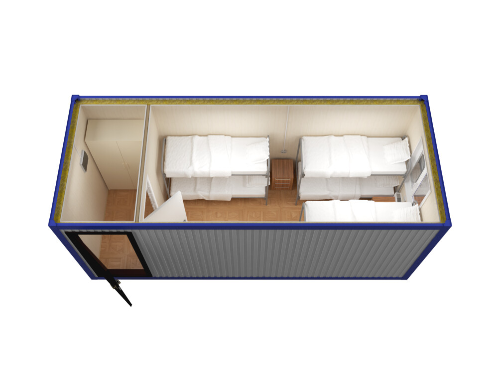 При утеплении 50 мм и наличии конвектора 2 кВт контейнер поддерживает +12 градусов Цельсия при наружной -20 градусов Цельсия. Для комфортной температуры +18 градусов рекомендуем зимний пакет с утеплением 100 мм — доплата 28 000 ₽, позволяет работать до -28 градусов с одним конвектором 2 кВт. В Сибири устанавливаем утепление 150 мм за доплату 52 000 ₽.