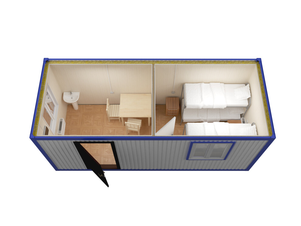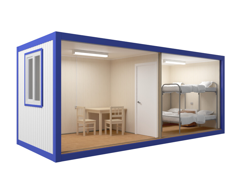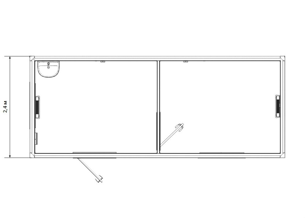В 5-метровом контейнере площадь 12 м² делится перегородкой пополам: первое помещение — 6,0 м² (2,5х2,4 м), второе помещение — 6,0 м² (2,5х2,4 м). Каждое помещение имеет отдельное окно. Вход осуществляется в первое помещение, второе доступно через межкомнатную дверь. В 9-метровой версии площадь каждой секции увеличивается до 10,8 м².