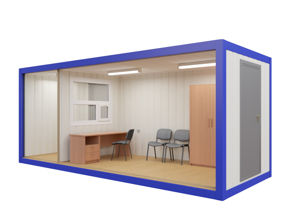 В рабочем помещении комфортно размещаются 2 охранника с двумя столами 1,2х0,6 м и местом для 3-4 мониторов видеонаблюдения. Проходной тамбур рассчитан на одновременный пропуск 3 человек (1 входящий + 1 исходящий + 1 на досмотре) без скопления. Для объектов с потоком более 300 человек/час рекомендуем 9-метровую версию с двумя независимыми проходными зонами.