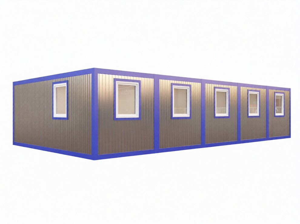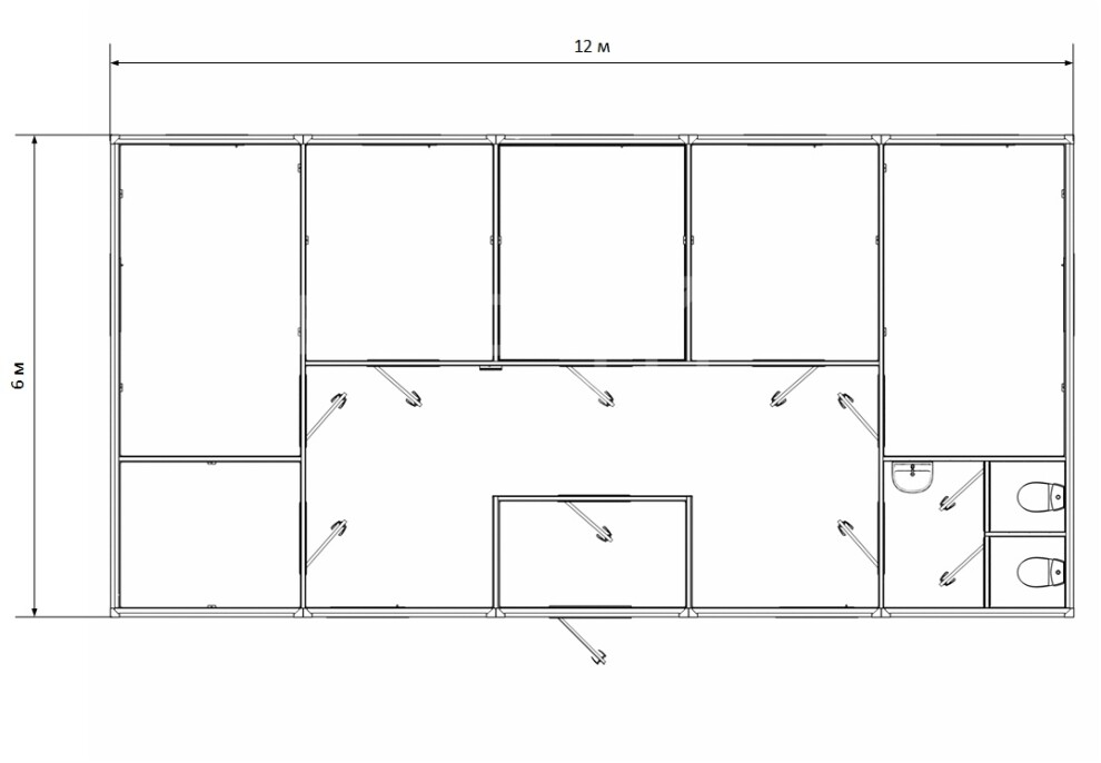 Оптимальная планировка — 6 комнат по 8-10 м² каждая + санузел 4 м² + тамбур 3 м² + коридор 15 м² создают законченный АБК без необходимости стыковки отдельных модулей