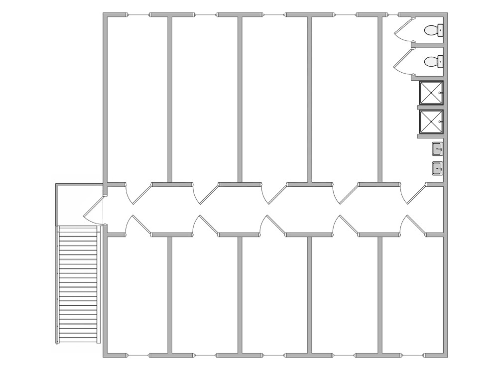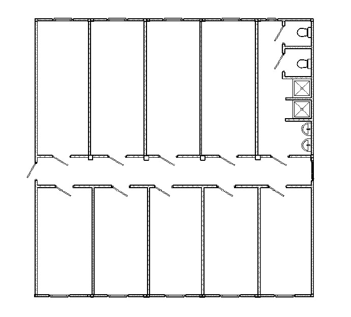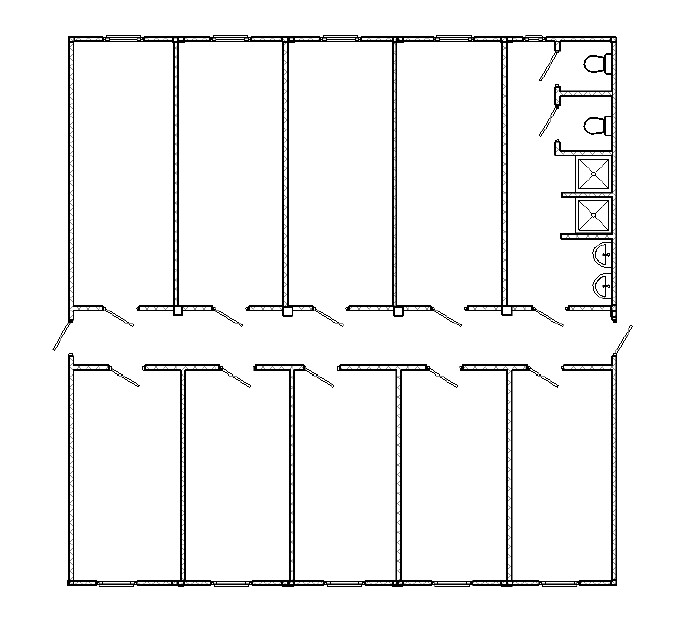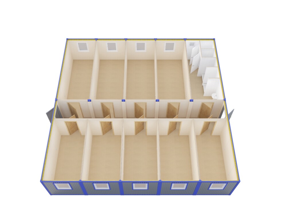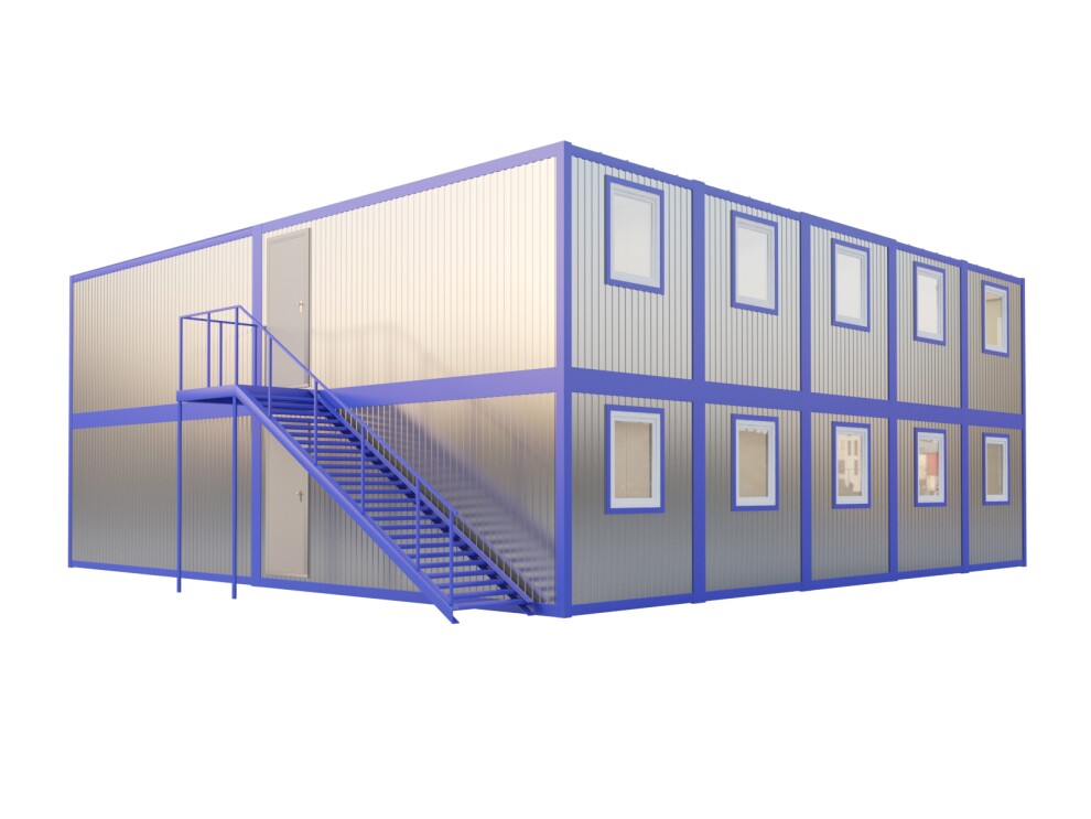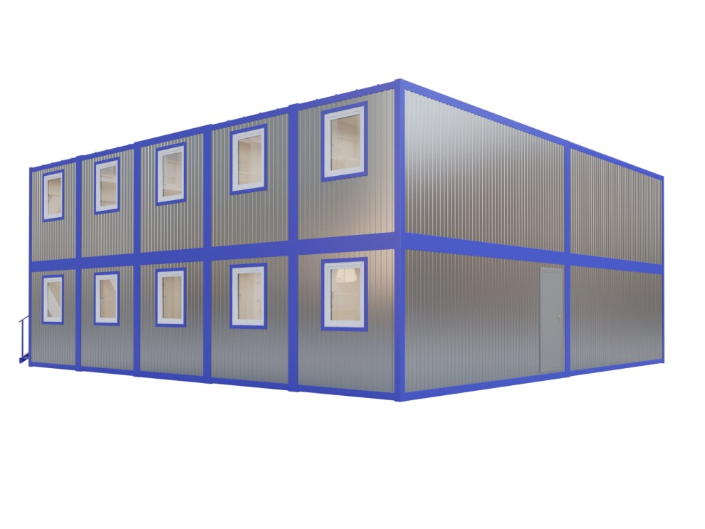 Двухэтажное здание из 20 блоков 12х12х7 м. 9 комнат и санблок на каждом этаже, ЛДСП, линолеум. Аренда от 85 000 ₽/мес, продажа от 2 400 000 ₽. Доставка по СПб, Москве и России за 24ч.