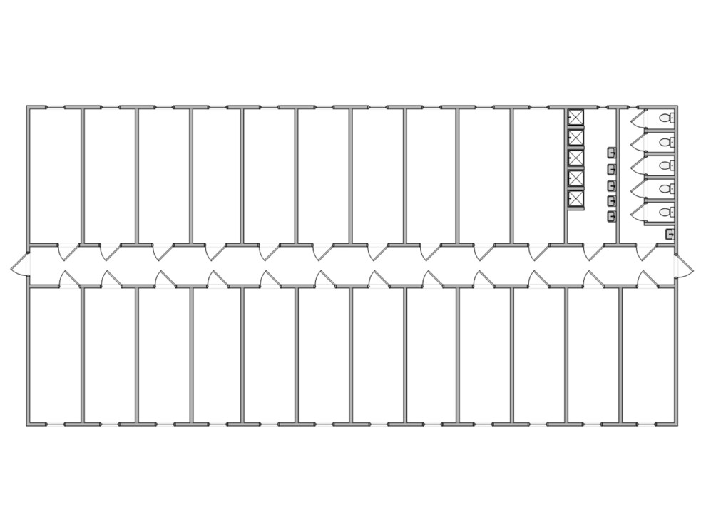 Оптимизированная санитарная инфраструктура — по одному санблоку с 5 душевыми и одному с 5 туалетными кабинами на этаж исключают очереди даже при одновременном использовании 20% жильцов