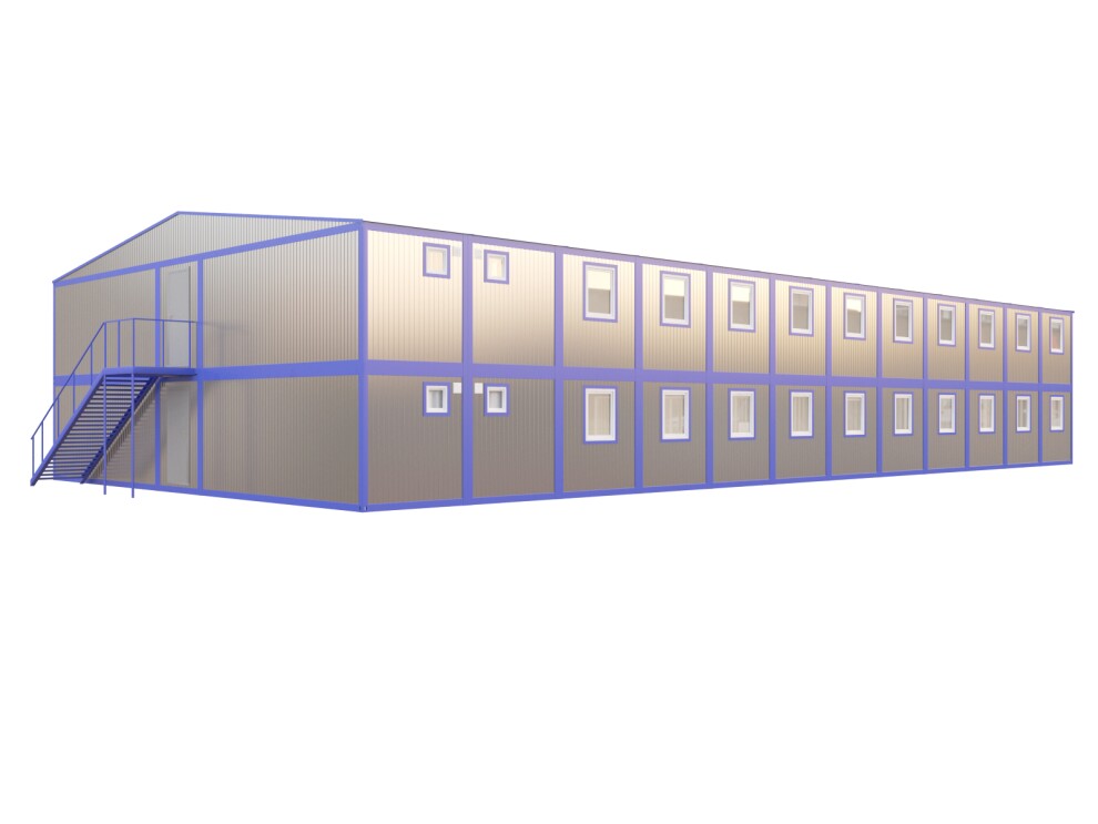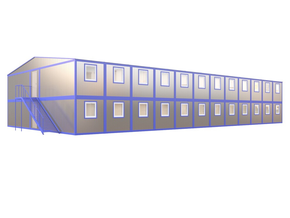 Двухэтажное здание из 48 блоков 28,8х12х7 м. 44 жилых помещения, 2 санблока с душем и туалетами на этаж. Аренда от 180 000 ₽/мес, продажа от 5 800 000 ₽. Доставка по СПб, Москве и России за 24ч.