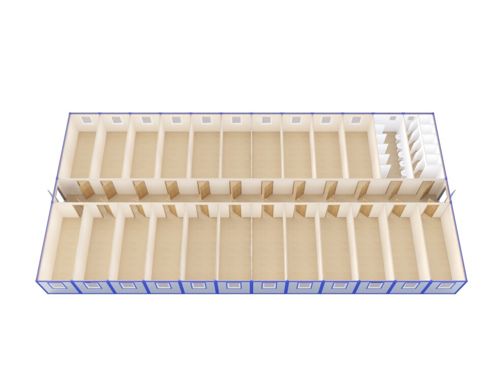 Рекордная вместимость — 44 изолированных комнаты по 6-7 м² (22 на каждом этаже) позволяют разместить до 44 человек для постоянного проживания или до 88 человек для вахтового метода с двухъярусными кроватями