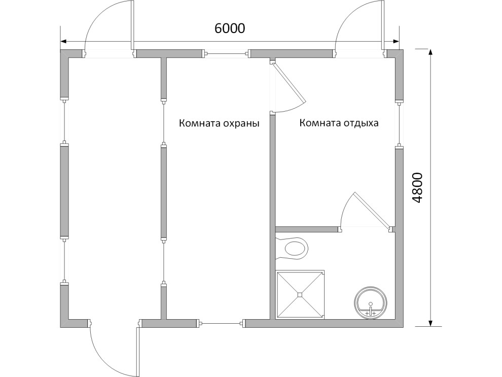 Проходная №10 из двух 6-метровых блоков 6х4,8х2,4 м. Санузел с душем и унитазом, 2 окна с форточкой 1100х900 мм. Аренда от 21 000 ₽/мес, продажа от 560 000 ₽. Доставка по СПб, Москве и России за 24ч.