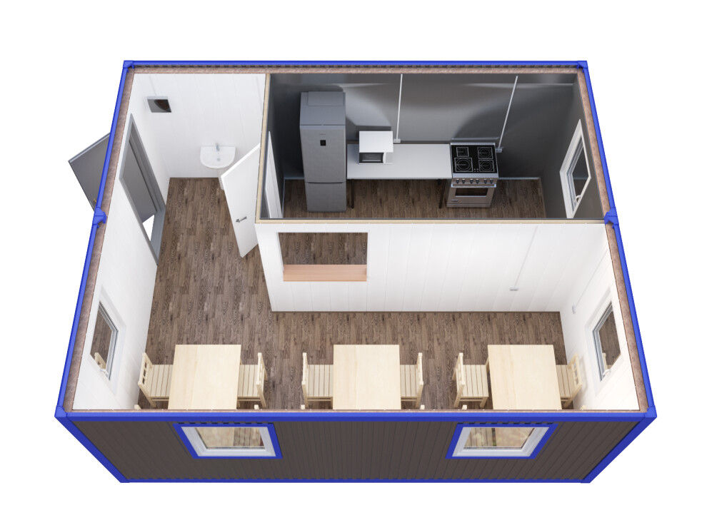 Модульная столовая 28,8 м² — это компактное решение из двух блок-контейнеров для организации питания персонала на стройплощадках, карьерах и производственных объектах по всей России. Благодаря продуманной планировке с залом и техническим помещением вы получаете готовое предприятие общественного питания, пригодное как для временного размещения, так и для постоянной эксплуатации в условиях Санкт-Петербурга, Москвы и регионов.
