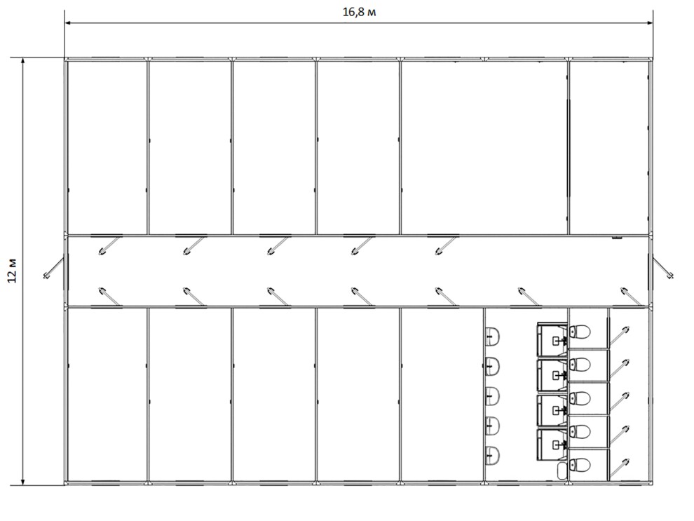 В базовой планировке комфортно размещаются 36 человек (по 4 человека в каждом из 9 изолированных помещений). Для проживания 50 человек рекомендуем увеличить количество санузлов до 4 — стоимость модификации 220 000 ₽. Максимальная нагрузка на пол — 300 кг/м².