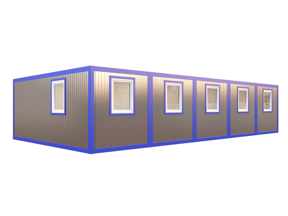 Модульное здание №7 из 5 блоков 6х12х2,4 м. Профлист С8, тамбур, утепление 50 мм, 9 окон ПВХ. Аренда от 35 000 ₽/мес, продажа от 1 050 000 ₽. Доставка по СПб, Москве и России за 24ч.