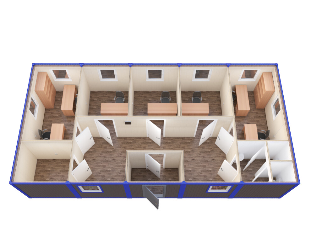 В пяти изолированных помещениях комфортно размещаются 18-20 человек для работы или 14-16 человек для временного проживания. Санузел с двумя унитазами и умывальником рассчитан на обслуживание до 25 человек в смену. Для проживания 22+ человек рекомендуем установку душевой кабины — стоимость модификации 85 000 ₽.