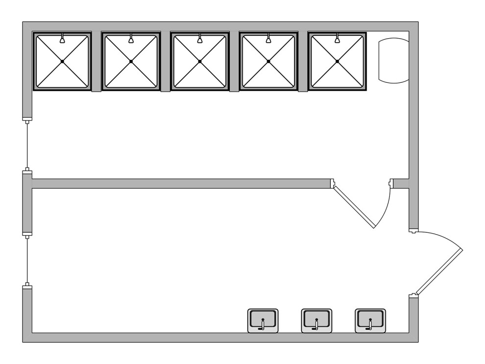 При организации потока «вход-выход» 16 человек проходят душ за 25 минут: 5 человек в душевых кабинах одновременно (по 3 минуты на человека), остальные ожидают в раздевалке. Для ускорения потока до 15 минут рекомендуем добавить 2 душевые кабины — стоимость модификации 85 000 ₽.