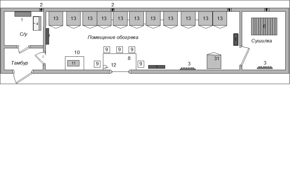 В зоне сушилки размещаются до 20 комплектов мокрой спецодежды и обуви на стеллажах. При естественной сушке (без конвекторов) полное высыхание занимает 6-8 часов. С установкой двух конвекторов 2 кВт время сушки сокращается до 2,5-3 часов. Для бригады из 30+ человек рекомендуем две раздевалки — доплата 620 000 ₽ за второй модуль.