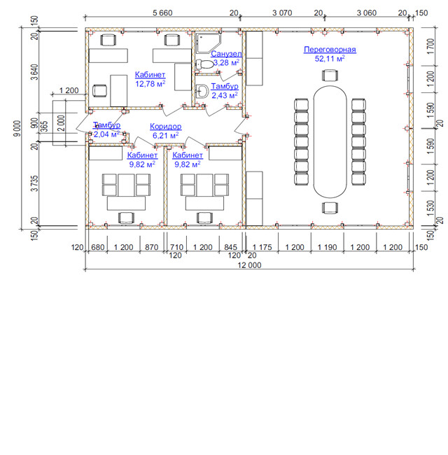 Переговорная 36 м² комфортно размещает 14 человек за столом размером 4х1,2 м. При организации трёх совещаний по 1,5 часа с перерывами на подготовку штаб обслуживает до 42 участника за рабочий день. Для увеличения вместимости до 20 человек устанавливаем раскладной стол — доплата 45 000 ₽.