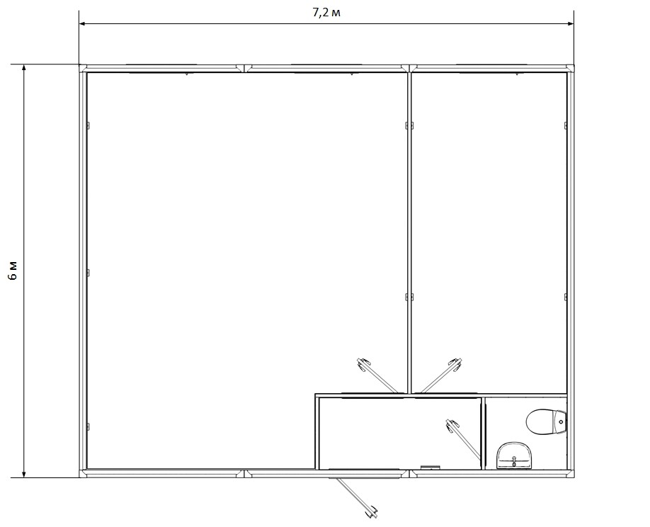 Габариты: длина 7,2 м, ширина 6 м, высота 2,4 м, общая площадь 43,2 м²
