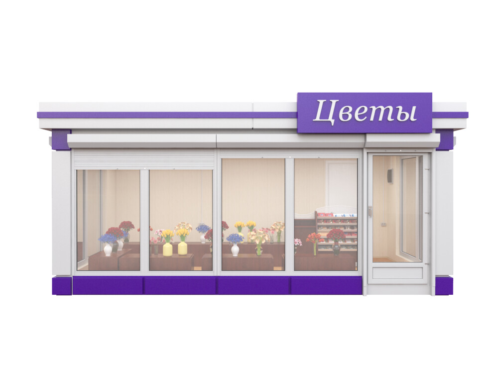 Цветочный киоск 6х4,8х2,6 м из 2 блоков. Сэндвич-панели 80 мм, панорамное остекление 3 стороны. Аренда от 35 000 ₽/мес, продажа от 1 200 000 ₽. Доставка по СПб, Москве и России за 24ч.